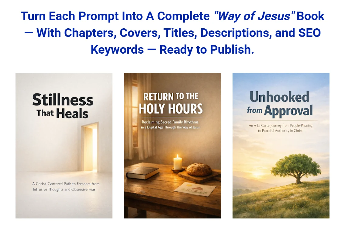 - Unique “Way of Jesus” Framework: The prompt invents a custom, cohesive 3-step spiritual framework tailored specifically to the book’s niche. For a book on Burnout, it invents a framework for rest; for Digital Anxiety, a framework for presence. This ensures the book is a transformative journey, not just a list of tips.
